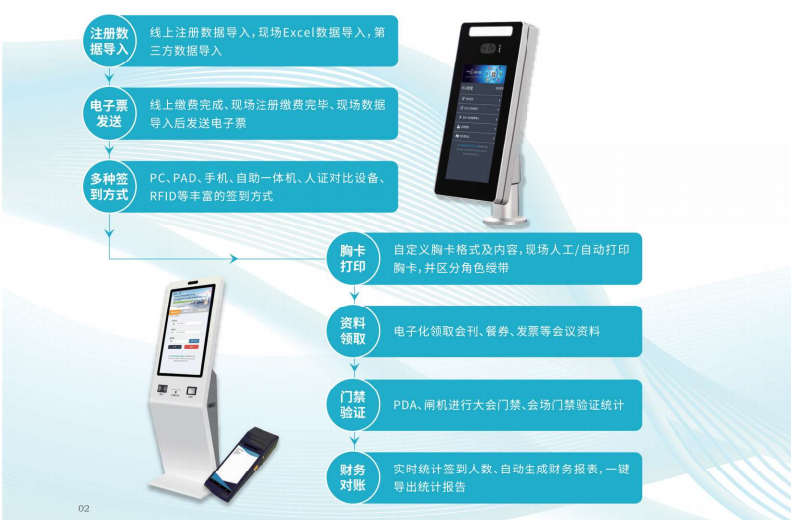 现场注册签到系统为了会议组织管理者实现参会代表现场报到管理并进行数据查询、数据统计而专门研制的管理系统软件。它直接基于会议服务平台系统数据库,集成参会代表自助注册、自助签到、条码识别管理、胸卡打印管理等,实现了会议注册签到管理的一体化,极大地方便了参会人员的现场签到和会议管理人员的现场收费、胸卡打印、人员统计和查询。其主要功能有: