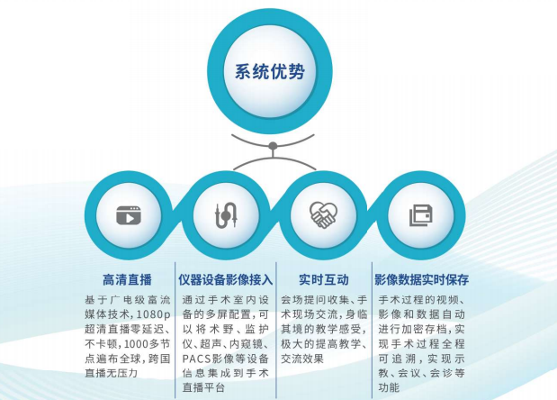 美时美刻手术高清视频直播平台基于会场WIFI及专线网络带宽保障,基于领先的内容接入实时视频处理技术,提供易接入、低延迟、高清流畅的音视频直播服务。系统同时提供包括访问质量、访客数据、各功能用量等的全景监控信息,可以广泛应用于覆盖电商、娱乐、在线教育、游戏、金融、大型赛事等直播应用场景
